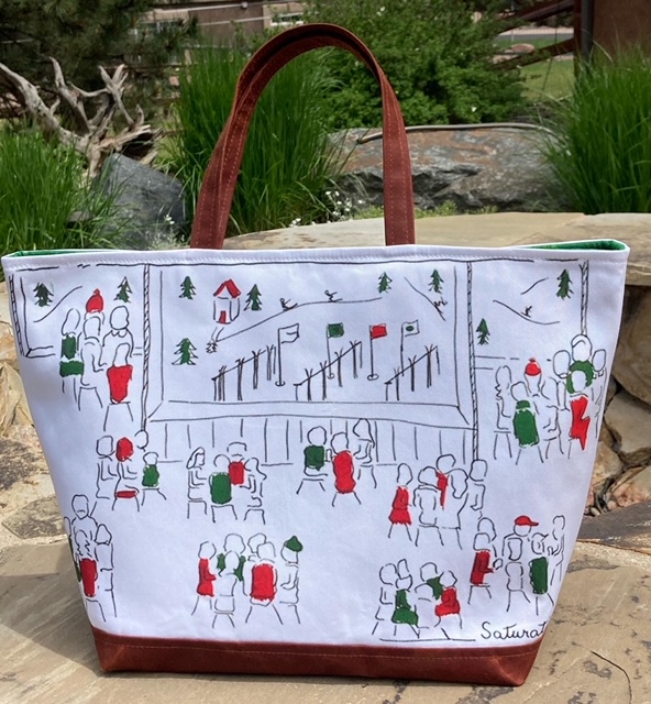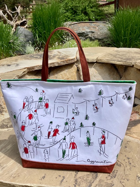 I am SO excited to share these original designs from my grandmother … “Aggravation” and “Saturation” are a glimpse into the skiers life at Stratton Mountain in Vermont where my entire family grew up skiing. Long ski lift lines and crowded lunches in the lodge inspired these original designs. I am humbled to have the opportunity to create hand crafted accessories with these original designs. Virginia “Gini” Chase Howard attended Parsons School of Design in NYC and graduated around 1946.